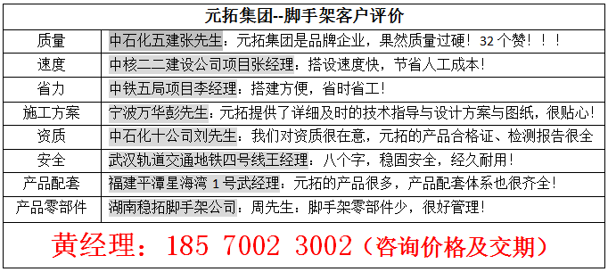 發(fā)布時(shí)間:2016-09-09 瀏覽量:3037隨著腳手架行業(yè)的發(fā)展腳手架項(xiàng)目作業(yè)技術(shù)規(guī)范現(xiàn)在引起了社會(huì)廣泛關(guān)注,因?yàn)榻鼛啄昴_手架項(xiàng)目事故發(fā)生不少見(jiàn),提高腳手架作業(yè)技術(shù)水平你?如何加強(qiáng)腳手架作業(yè)管理呢?下面小編和元拓集團(tuán)的網(wǎng)友們分享下。 加強(qiáng)腳手架項(xiàng)目作業(yè)水平和管理具體措施1、隨著高層和高難度作…