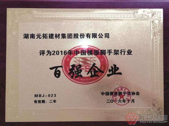 元拓被評(píng)為2016年中國(guó)模板腳手架行業(yè)百?gòu)?qiáng)企業(yè)